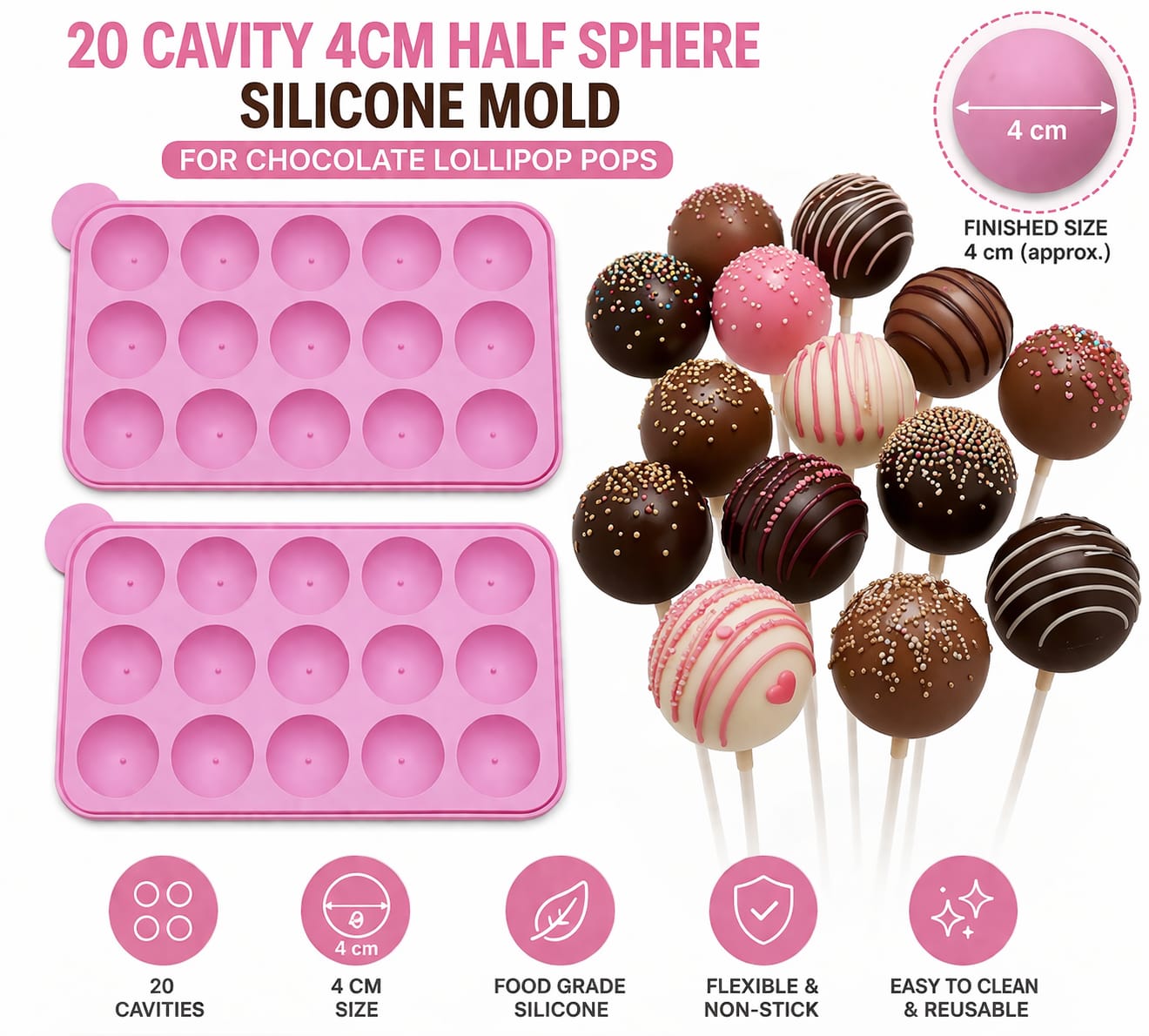 Create multiple chocolate lollipop pops efficiently with this 20 cavity half sphere silicone mold. Each cavity produces a smooth 4 cm round chocolate sphere, ideal for lollipop chocolates, cake pops, and filled treats. The flexible food-grade silicone allows easy demolding and professional glossy finish. Perfect for home bakers, chocolatiers, and bulk production for parties and events.