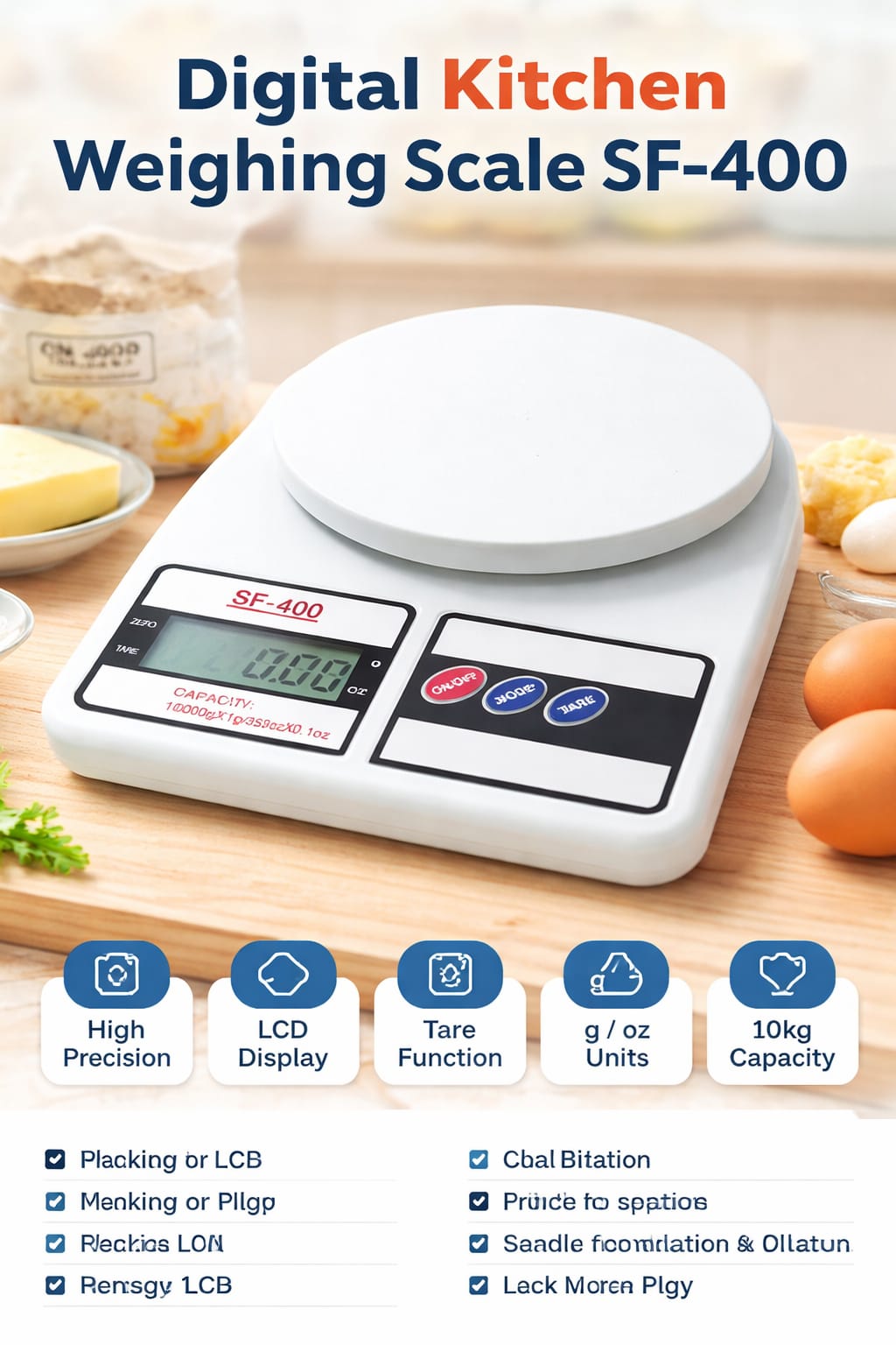 This Digital Kitchen Weighing Scale (SF-400) is perfect for accurate measurement of baking ingredients. With a clear LCD display and multiple weighing modes, it helps you measure flour, sugar, butter, and more with precision. Compact, lightweight, and easy to use for home bakers and professionals.